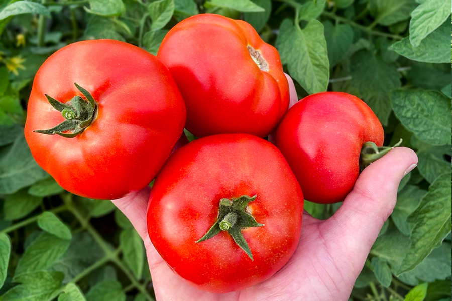 An early maturing determinate tomato, producing jumbo, crimson red globe-shaped, firm fruit with thick walls. Ideal for open field or high tunnel growing. Performs well in cold or cold-to-hot seasons.